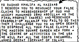 AL KAZZAAB REŞAD HALİFE’YETANRI’NIN ELÇİLİĞİNE İLİŞKİN SAHTE İDDİALARINIZDAN VAZGEÇMENİZİ VE MUHAMMED IBNI ABDILLAH’I TANRI’NIN SON PEYGAMBERİ (NEBİ) VE SON ELÇİSİ (RESÛL) OLARAK KABUL ETMENİZİ RİCA EDİYORUM. EĞER BUNU YAPMAZSANIZ, SİZİ TÜM SAHTE İDDİALARINIZI ÇÜRÜTMEK İÇİN ABD’DEKİ FAALİYETLERİN MERKEZİ OLAN MADISON SQUARE GARDEN NEW YORK’TA AÇIK BİR TARTIŞMAYA DAVET EDİYORUM, YAPILACAK TÜM MASRAFLARI ÖDEYECEĞİZ.AHMED DEEDAT (İSLAM’IN HİZMETKARI)