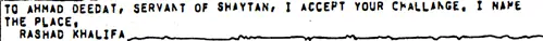 ŞEYTAN’IN HİZMETKÂRI AHMED DEEDAT’A, MEYDAN OKUMANI KABUL EDİYORUM. YERİN ADINI BELİRTİYORUM,REŞAD HALİFE